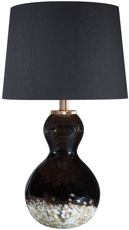 The Arma table lamp exhibits a voluptuous hourglass shape finished in contrasting black and copper detailing that pairs beautifully against the warm lighting of the modified drum shade.