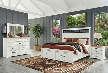 This queen panel storage bed delivers casual style with substance. An inset metal detail on the headboard displays a unique take on modern farmhouse design. The bed's sturdy silhouette, classic white finish and black pulls exude a comfortably cozy vibe in your soothing sanctuary. Storage drawers are spacious enough for all your essentials.