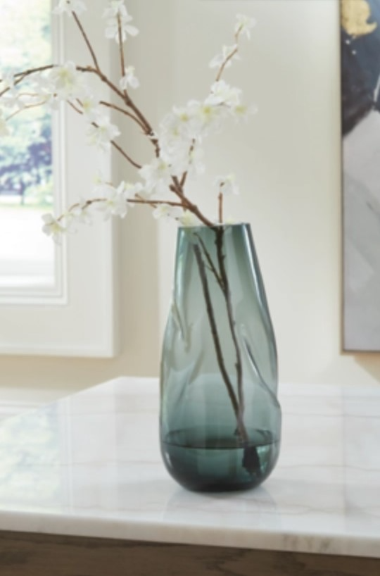 Sleek. Contemporary. Chic. This vase has an organic sense of movement, recalling seaside aesthetics with its teal glass. A stunning solo accent, it also acts as a beautiful vessel for florals and other decorative fillers.Read More