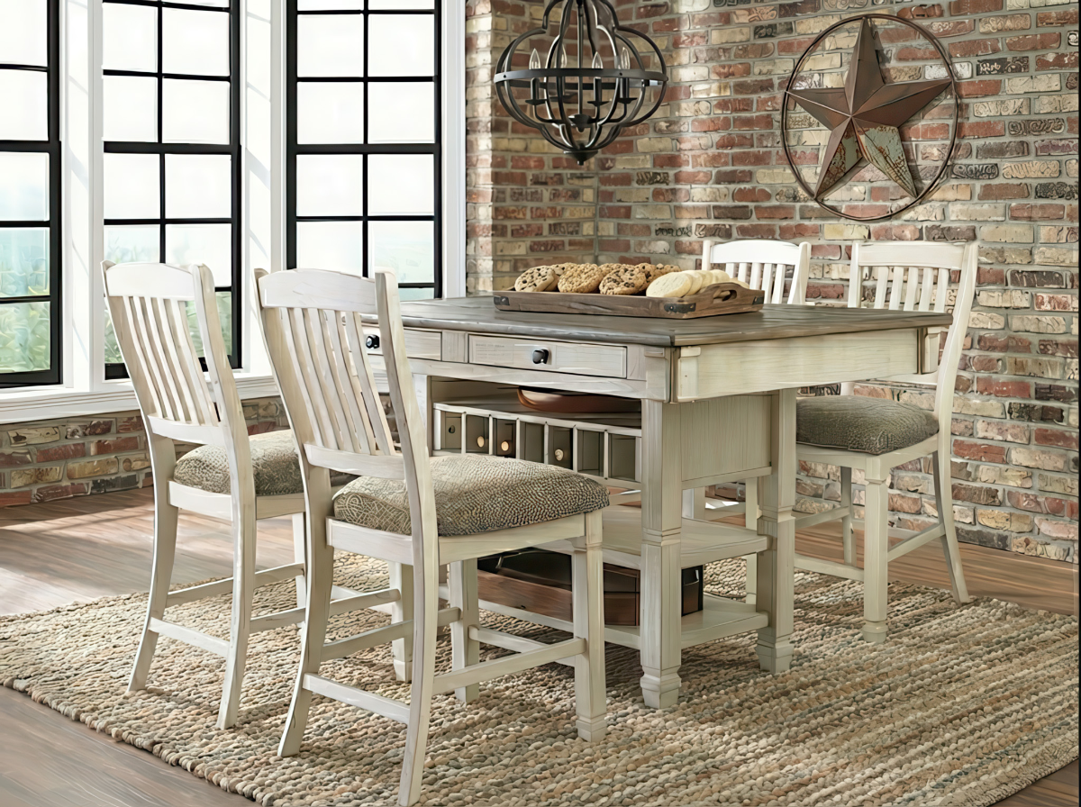 In South Texas, the best memories are made gathered around the table. This beautiful counter-height dining set is designed for exactly that—casual hospitality that lasts long after the meal is over. The elevated height creates a relaxed, conversational atmosphere perfect for appetizers and drinks. The sturdy table features a distressed antique white base with built-in wine bottle storage and a useful utility drawer, topped with a rich, dark wood surface that handles daily use with ease. The set includes four matching slat-back stools with comfortable, durable upholstered seats which makes this set a South Texas favorite.Read More
