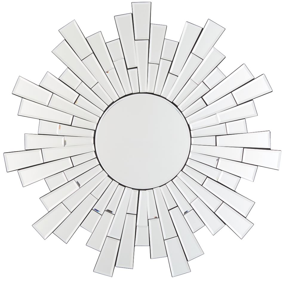 Need a burst of light for a dark interior? Radiant light is delivered from the sunburst design of this accent mirror. Framed in a mosaic spray of cut glass tiles, the circular beveled mirror will beautifully brighten up any wall space.Read More