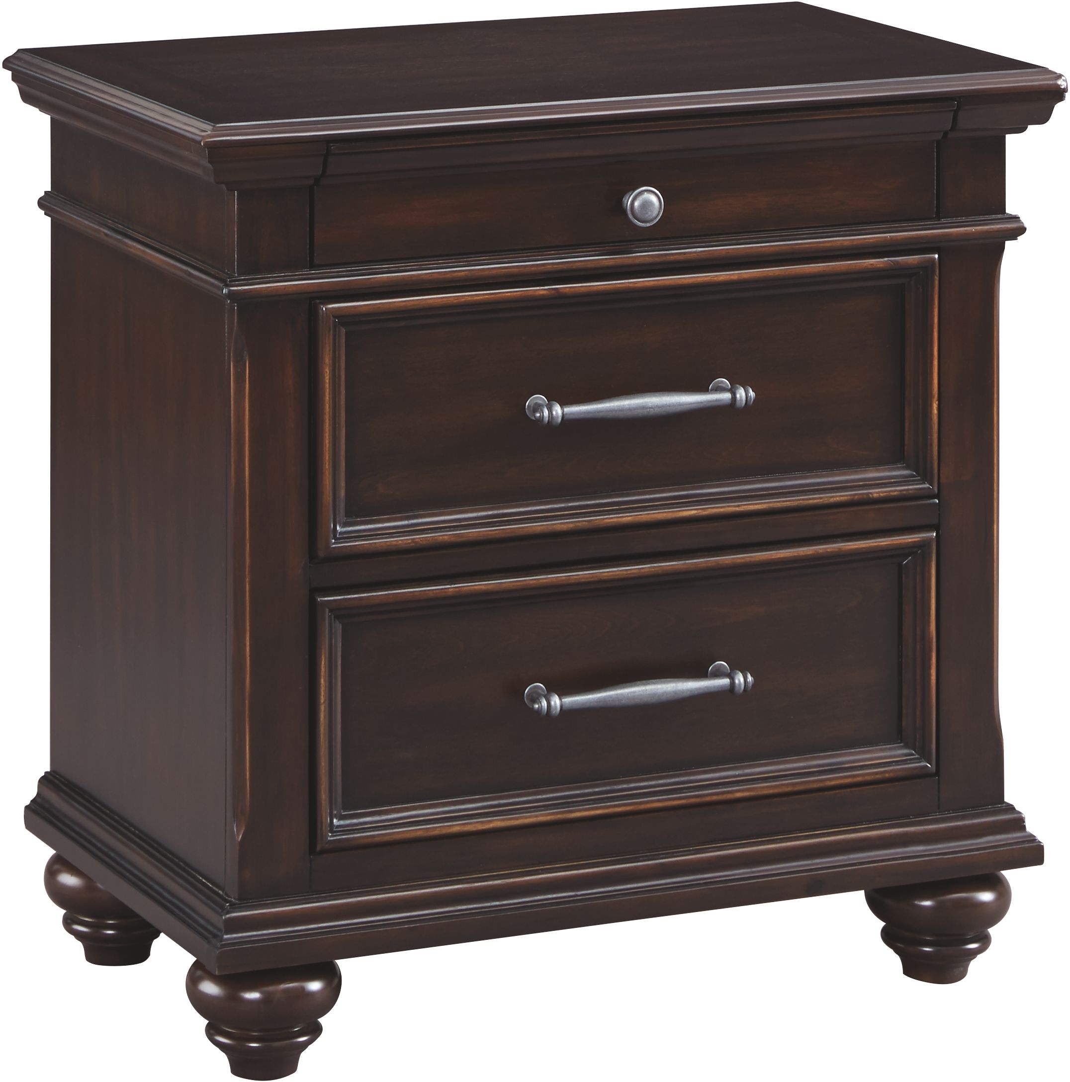 Store your treasures and trinkets in style with the single felt-lined and 2 smooth-gliding drawers of the dark brown Brynhurst drawer nightstand. Whether placed in your room or in guest rooms, treat yourself to ample storage.