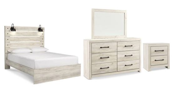 Includes a queen panel bed (headboard, footboard and rails), 6-drawer dresser, mirror and a 2-drawer nightstand
