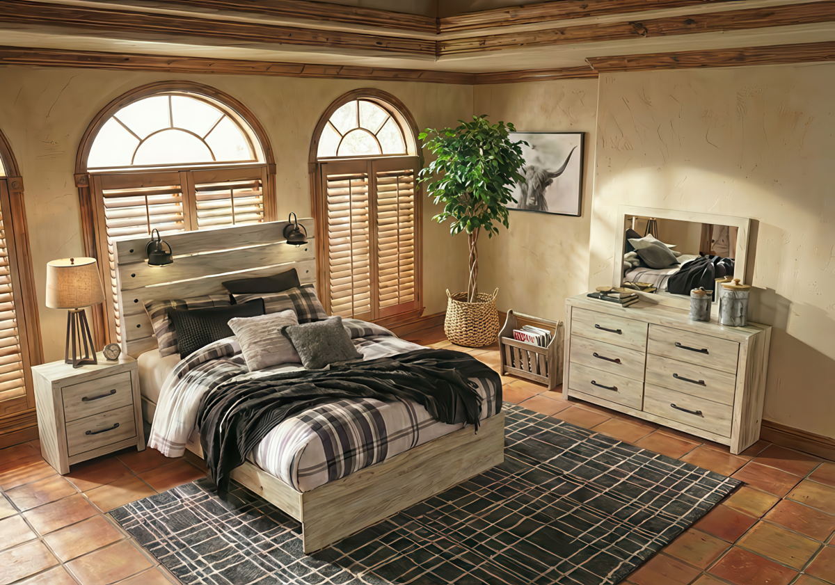Modern Ranch Style for the Valley, The Ashley Cambeck Bedroom Collection proves that rustic style can be bright and airy. The finish is a unique "wispy white" over replicated oak grain, giving you the authentic look of weathered driftwood without the high price tag or rough texture. It is a look that perfectly complements the modern ranch and coastal styles popular across South Texas and the Rio Grande Valley.