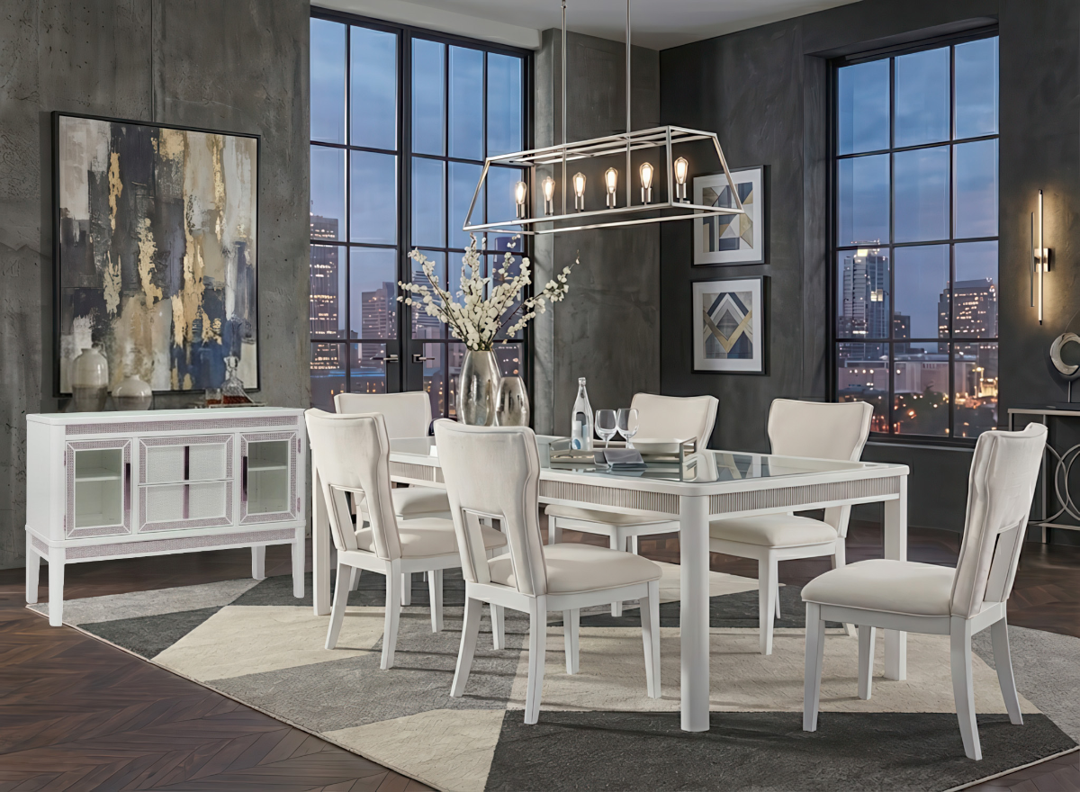 Take this featured white and glass dining set. It captures the essence of modern living: sleek enough for a downtown loft, yet inviting enough for a sprawling South Texas ranchland home. The bright finish reflects our abundant natural light, while the upholstered seating ensures comfort during those long, hospitable evenings our region is known for. Ditch the dated, heavy wood sets and embrace a lighter, more sophisticated aesthetic that handles real life with ease. Shop our selection of durable, modern dining tables and chairs available right here in South Texas.