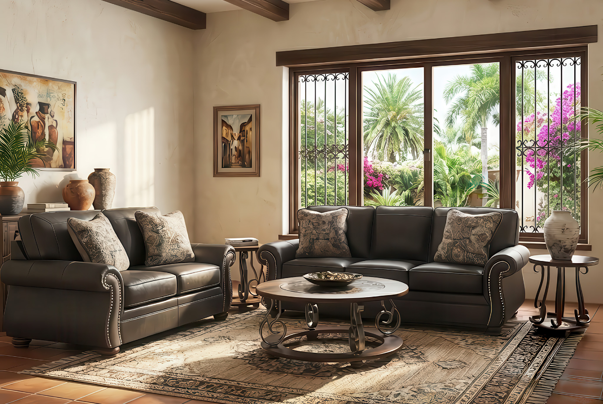 Look closely at the details. The prominent, antiqued nailhead trim outlining the rolled arms and base adds a layer of rustic definition that feels right at home against terracotta tile floors, stucco walls, or exposed beam ceilings common in the Rio Grande Valley and South Texas.