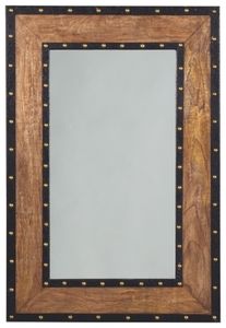 Made of burnt wood, this accent mirror’s frame has a reclaimed yet rich vibe. The addition of black metal banding and antiqued gold rivets punctuates the industrial look.