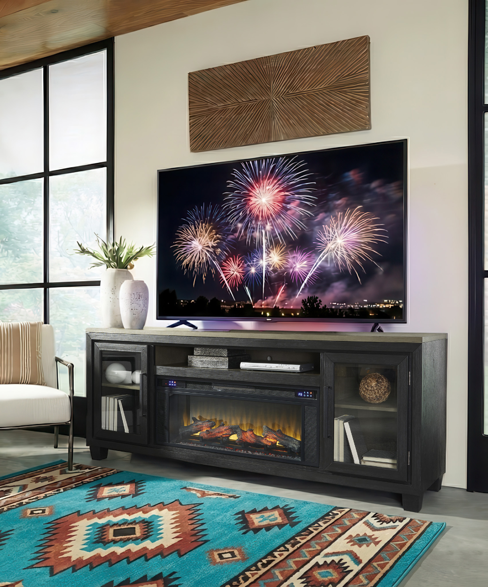 Upgrade your family room with an entertainment center that works as hard as it plays. The Foyland Media Console is designed to anchor your living space with a bold, rustic-industrial look that fits perfectly into South Texas homes—whether you have a modern loft in McAllen or a ranch-style home in Rio Grande City. Built to support today’s massive TVs (up to 75 inches), this console features a distressed dark finish that hides dust and wear, making it ideal for busy families. The mesh-insert glass cabinet doors allow remote control signals to pass through while keeping your electronics safe and dust-free. The functional Electric Fireplace adds both warmth with heat and beautiful aesthetics to your South Texas living, den or bedroom area. Stop balancing your TV on a wobbly table. Give your home the upgrade it deserves. This unit is in stock and ready for delivery across our entire border region network.