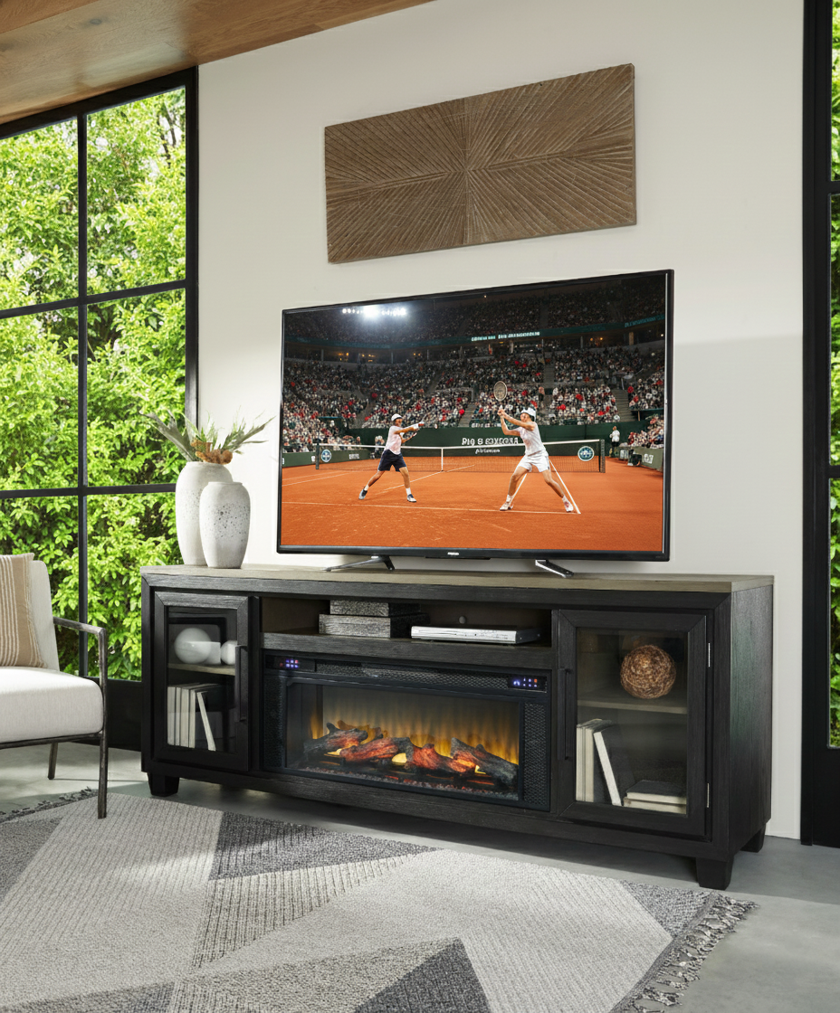 This TV stand with available fireplace option is rustic, casual contemporary style simply done right. Its two-tone color scheme features a rich brushed black finish accented with a dusty grayish brown wood tone. Open shelving for soundbars and decor, plus closed storage to hide cables and clutter. Choose the available fireplace option for additional function and aesthetics.Read More