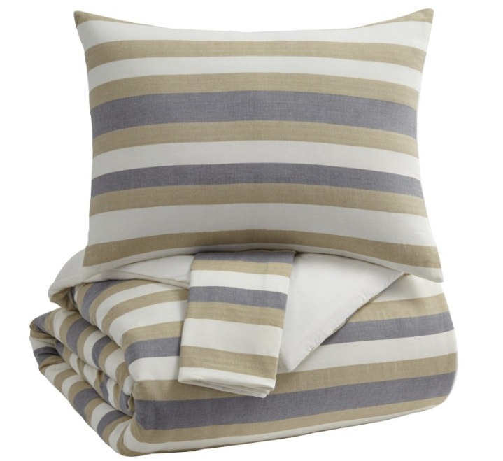 Dress your bed in striped delight with this king comforter set. Gray, tan and off white hues bring a fresh, contemporary vibe to your space. Snuggle up in the warmth of the cottony soft fabric. 3-Piece Comforter Set - Includes Comforter and 2 Shams. Yarn Dyed Striped Design in Gray, Tan and Off White. Cotton Cover with Polyester Filling. Machine Washable.