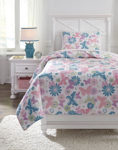 Butterflies are free to fly. Positively delightful twin quilt set in springy-zingy hues is every girl’s dream. Machine washability makes for easy-breezy care. 2-3 Piece Quilt Set - Includes Quilt and 2 Shams (1 in Twin). Butterfly and Floral Design in Pink, Green and Turquoise. Polyester. Machine Washable. For more than 70 years, we’ve set out to prove furniture can be made a better way. We design and craft timeless styles that are comfortable and livable. For our guests, living the American dream is as affordable as it is priceless. Our exclusive furniture and accessories start with a sketch inspired by the design team's travels around the world. Many Ashley products are assembled in the U.S. with domestic and imported parts, and quality tested so they arrive in your home, ready to enjoy for years. We recognize one style does not suit all. That’s why you’ll find so much to love in our wide selection of room-to-room furnishings. From industrial electric to rustic farmhouse, discover on-trend styles made for mixing and standing out. *Quilt set only, other items shown sold separately.