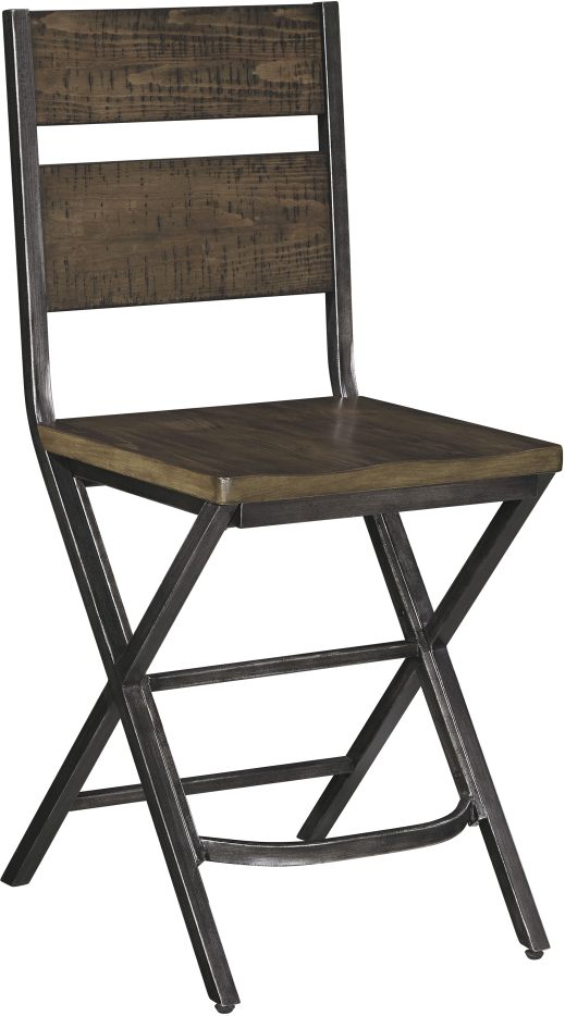 The Kavara barstool is counter height and sports crisscrossed metallic legs for support and a distressed wood finish.
