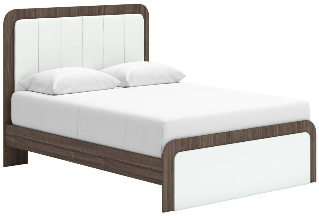 Looking to make a subtly striking statement in your bedroom? We've got you covered. This queen upholstered bed’s sophisticated two-tone treatment marries a warm brown finish over replicated walnut grain with a matte white finish. Highlighted with a wonderful white faux leather, the headboard features warm ambient lighting for that cozy feeling we all love at bedtime.Read More