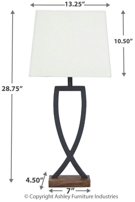 This table lamp is an enticing merge of mixed materials. Textured black finished metal stands poised atop a block of warm brown wood. Open design is right at home among casual decor.Read More