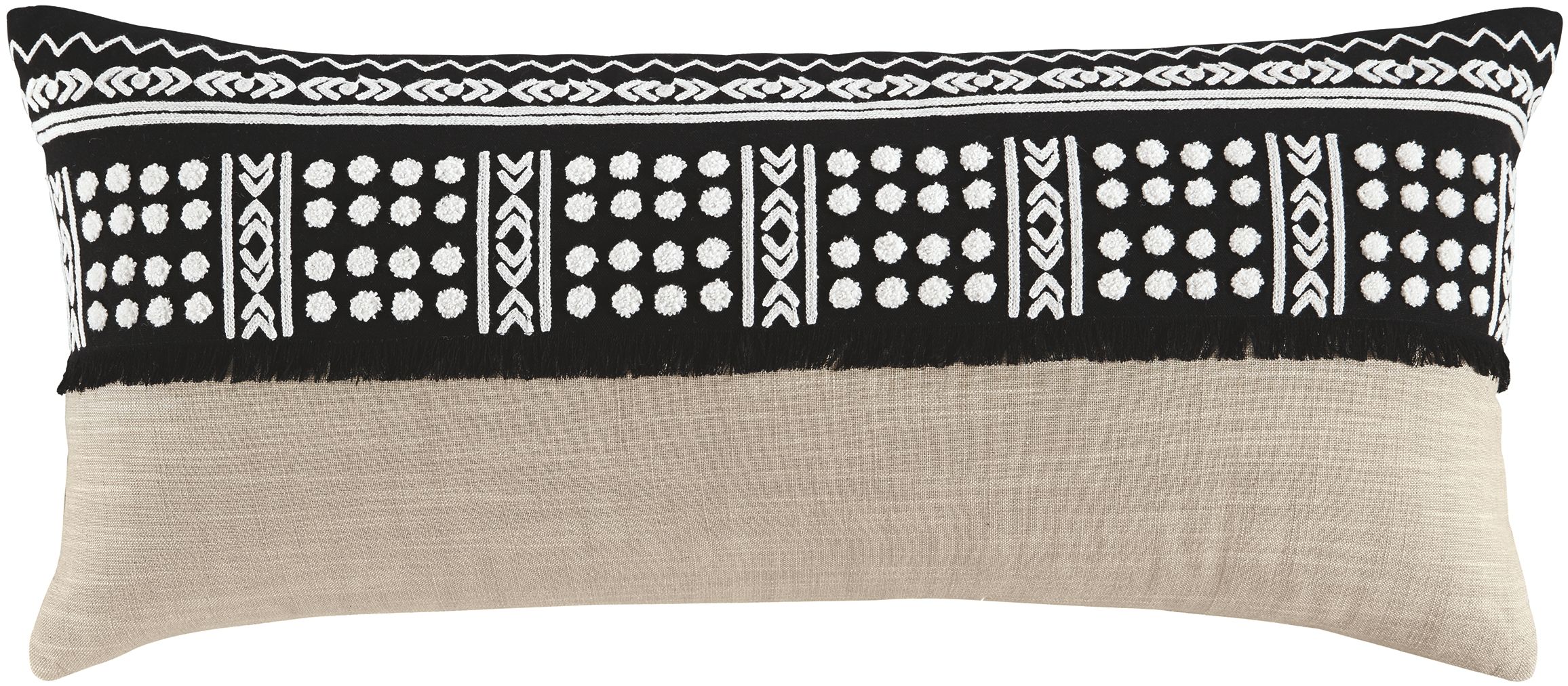 These Mateja pillow features a black front with white embroidery against a natural brown body for a calming aesthetic.