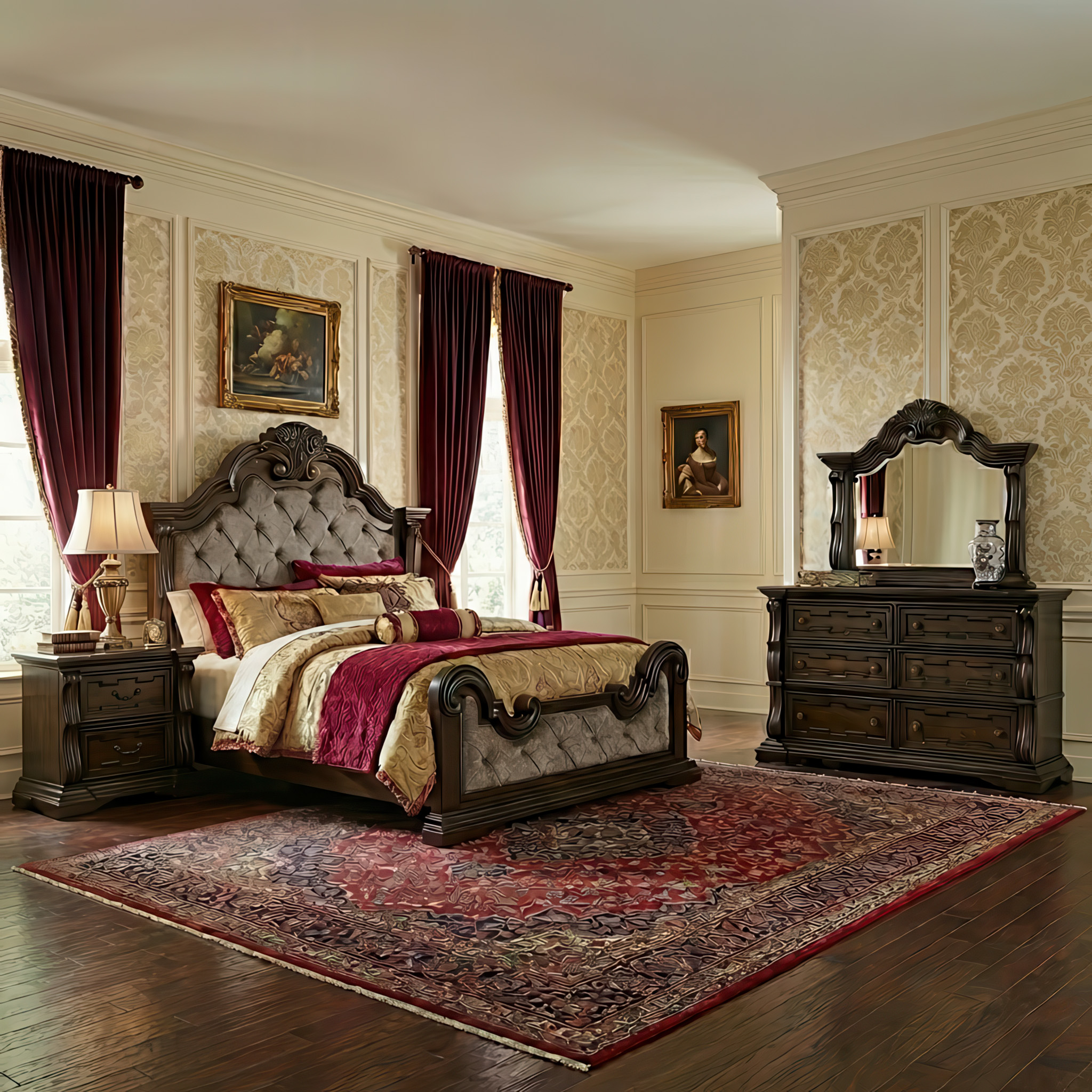 Looking for a bedroom set that combines comfort with classic beauty? The Maylee collection offers the best of both worlds. With its deep wood tones and soft, beige upholstered accents, it brings warmth and sophistication to any room. This gorgeous collection features curvaceous detailing, a luxurious tufted headboard, and a dark, savory brown finish that demands attention. It’s traditional design done right.