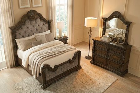 Includes bed (upholstered panel headboard, upholstered panel footboard and panel rails), dresser, mirror, and nightstand
