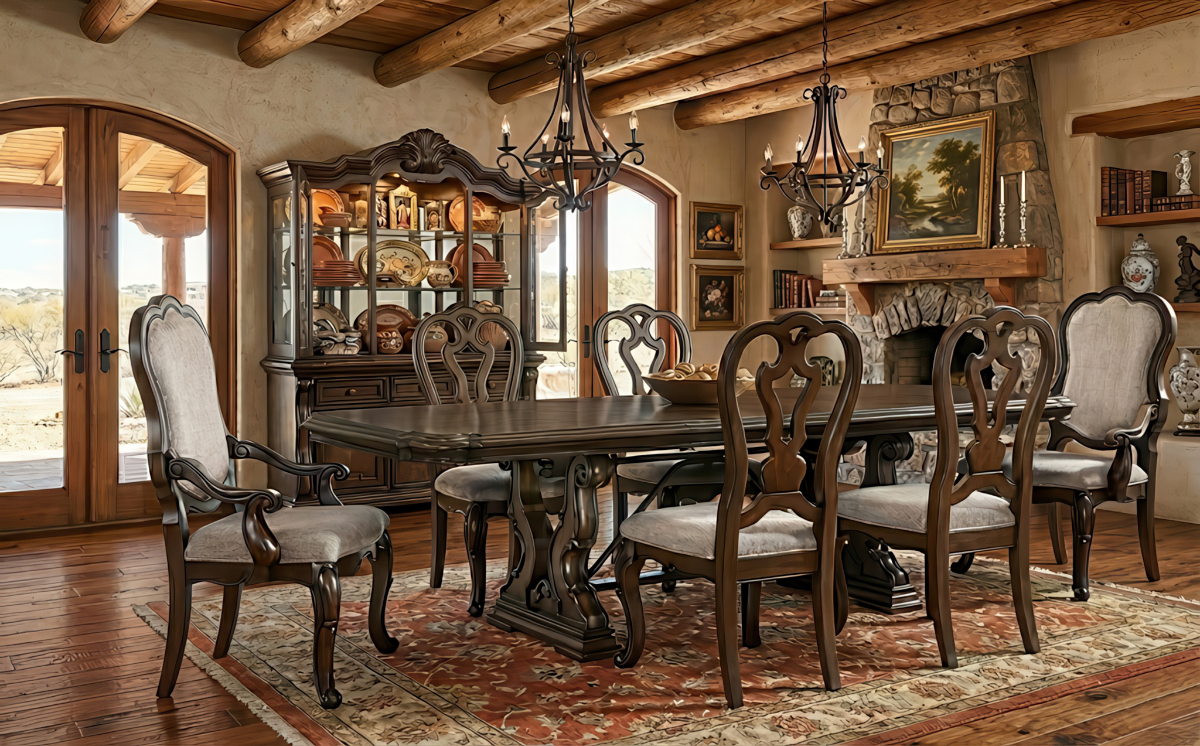 From its ornamental appliques to its large scale, this dining package makes a bold statement. With ornate details, the opulent set wows with stunning style. The look is timeless. The feel? Right at home.Read More