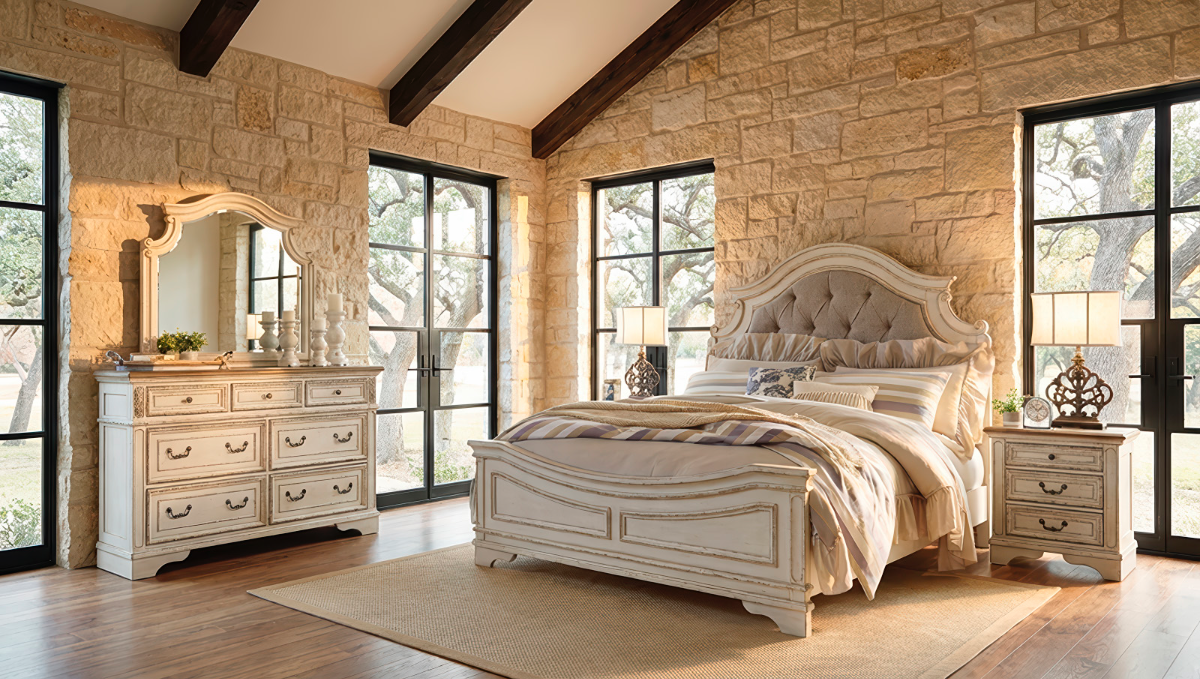 Capture the airy, welcoming spirit of the Valley with this dream retreat. Perfectly blending cottage comfort with South Texas character, the bed features a sumptuous, distressed chipped white finish that feels effortlessly weathered by time. The deep tufting adds a layer of cozy luxury, sure to put you at ease in true Southern fashion. Framed drawer fronts and decorative corbels echo the craftsmanship of historic local South Texas architecture, while the contrasting wood surfaces add a touch of earthy warmth to this bright, inviting collection.
