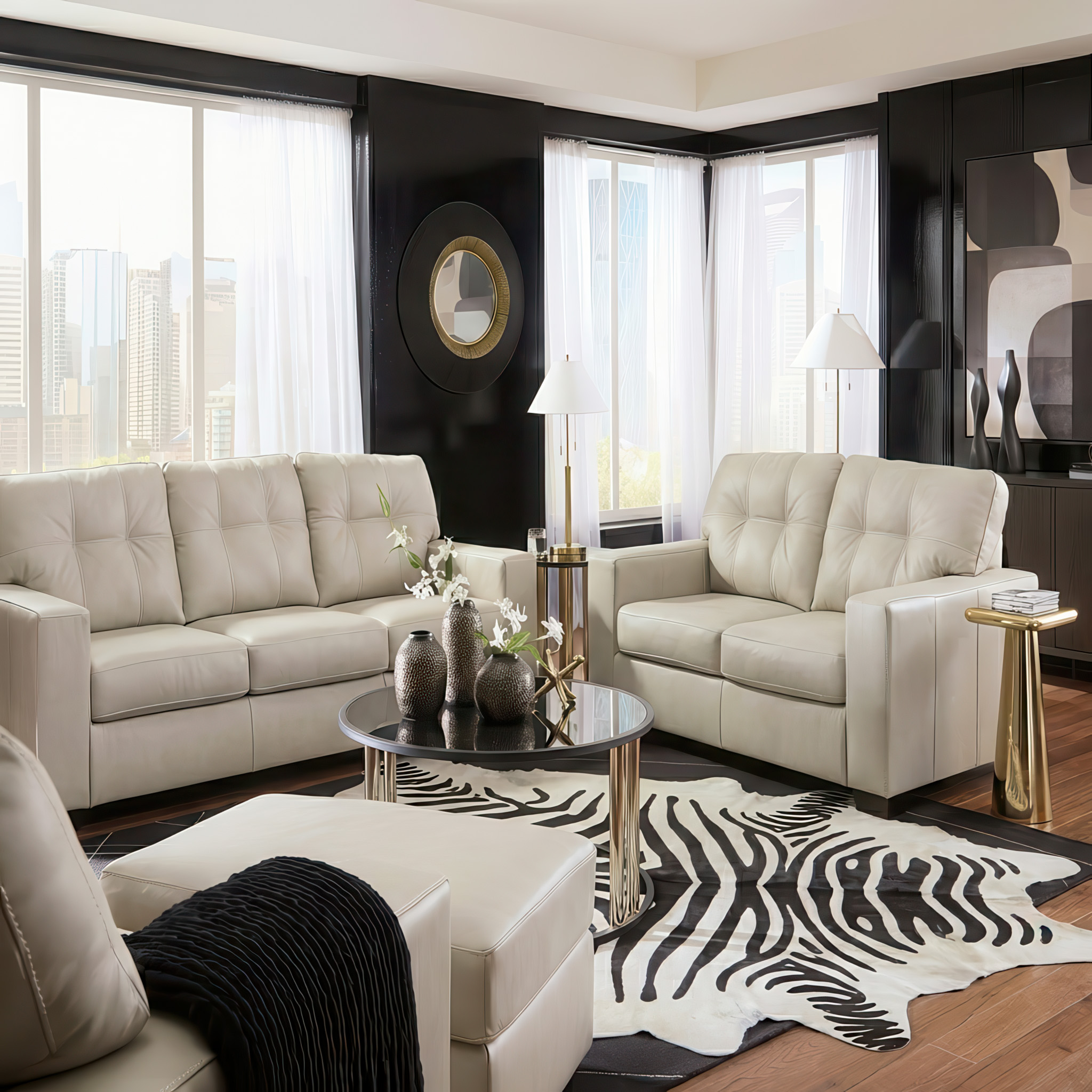 Make a bold statement in your living room with the Ashley Santorine Sofa. Upholstered in a sophisticated Bone leather match, this set offers the buttery soft feel of genuine leather in the seating areas with skillfully matched durable faux leather on the exterior—giving you affordable luxury without compromising on style.