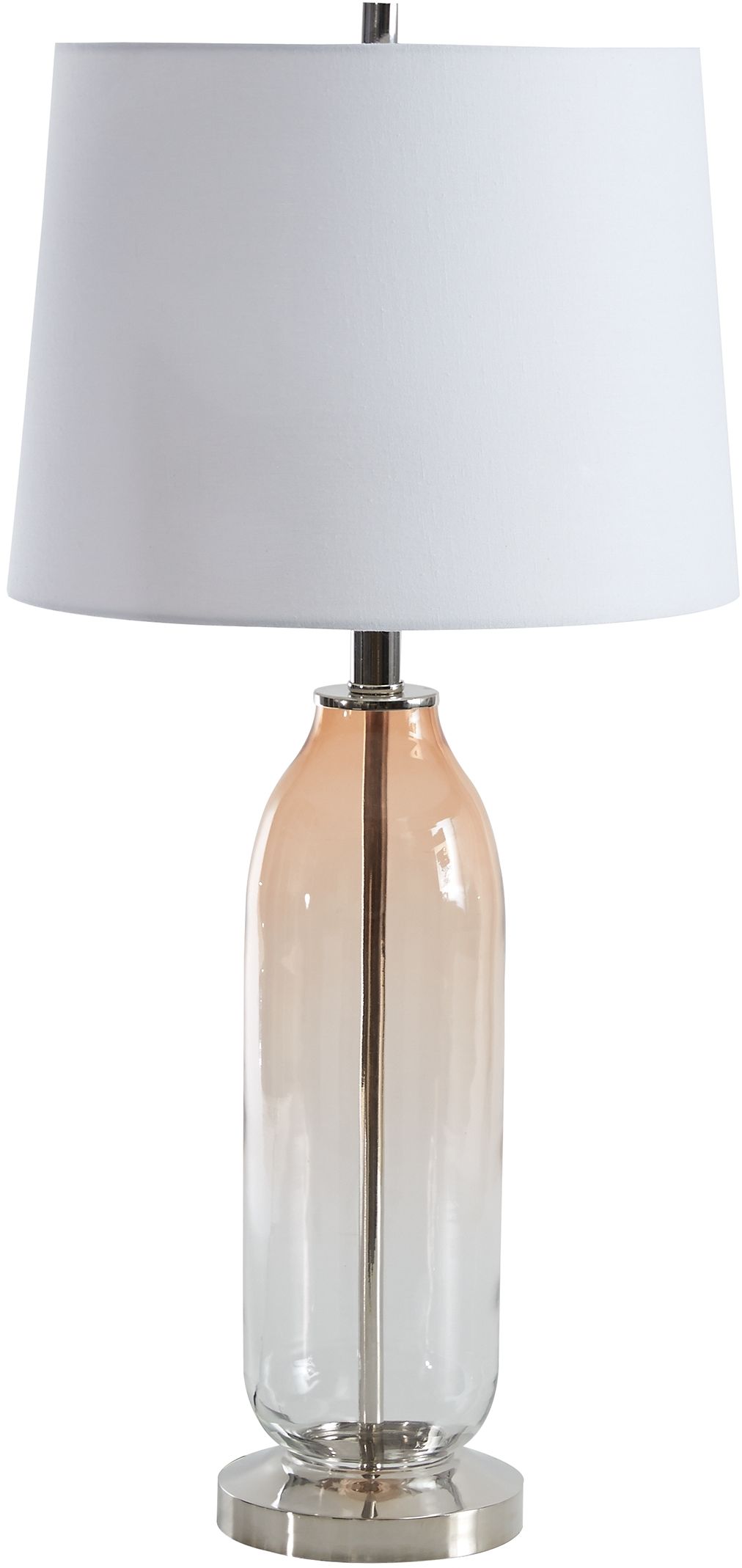 The Sheyla table lamp features a clear glass base with ombre hues of pink and a fabric shade that provides soft lighting.
