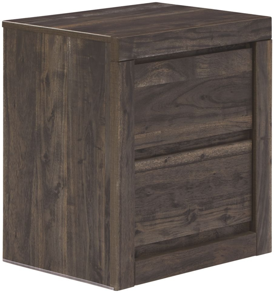 A charcoal finish and replicated acacia woodgrain gives the plank-style aesthetic a highly modern feel. Built-in USB and Qi wireless charging options make charging devices a breeze.
