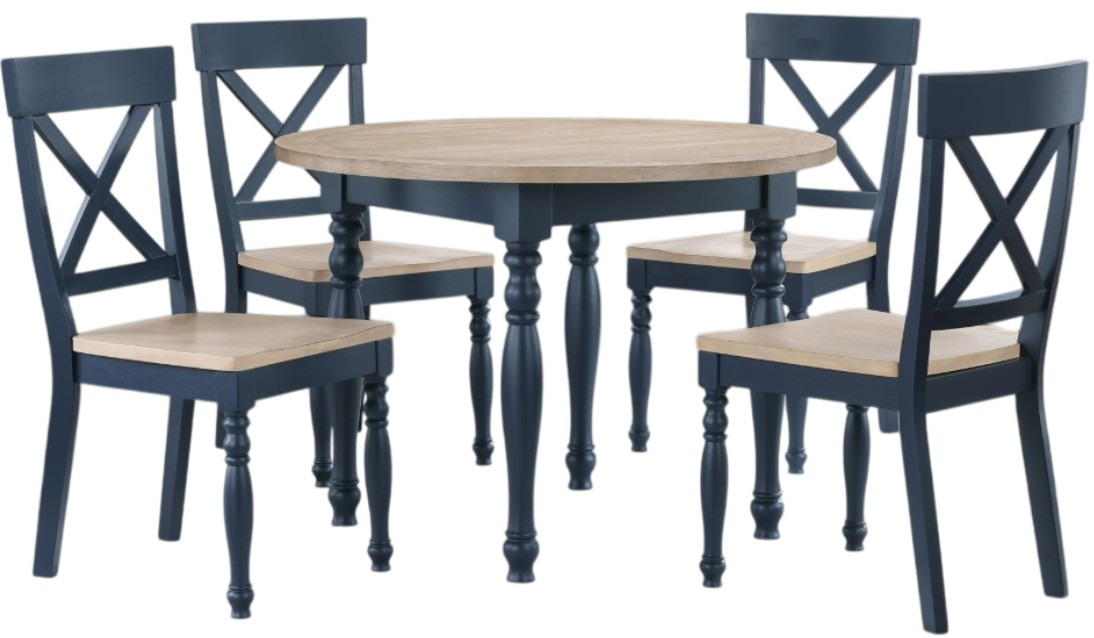 Bring charm and functionality to your dining space with the Darcy 5-piece dining set, a seamless blend of style and comfort. The 42" round table features a natural wood top and intricately turned midnight blue legs, combining farmhouse charm with modern elegance.Read More