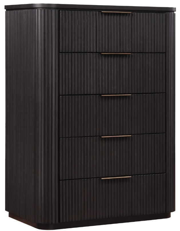 The Henry 5-drawer chest blends vertical storage with modern elegance. Crafted from oak veneers, Asian hardwoods, and engineered woods, it showcases reeded surfaces, rounded corners, and a sturdy plinth base. Five drawers, including a felt-lined top drawer, provide organized storage, while side metal glides ensure smooth operation and safety stops prevent accidental removal.Read More