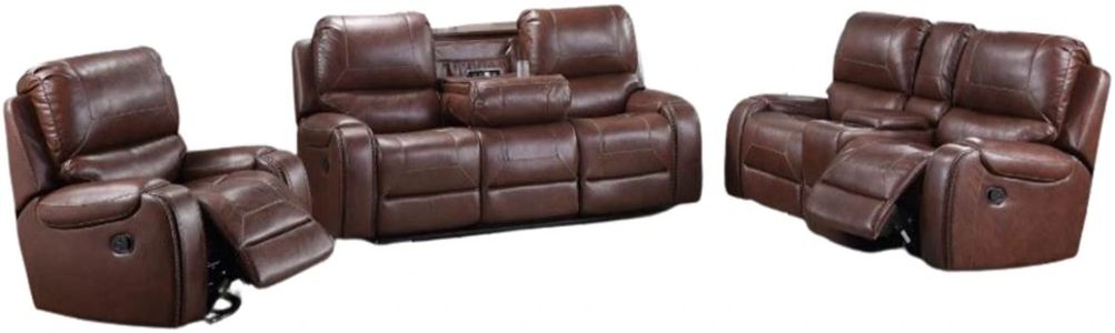Superior comfort and style are the hallmarks of this motion set. Featuring a leather-like cover with baseball stitching, this ensemble comes with a Sofa with a drop-down console & USB charging station; a Loveseat with dual rocker/recliner ends; and a rocker/recliner Chair with 360-degree swivel.Read More