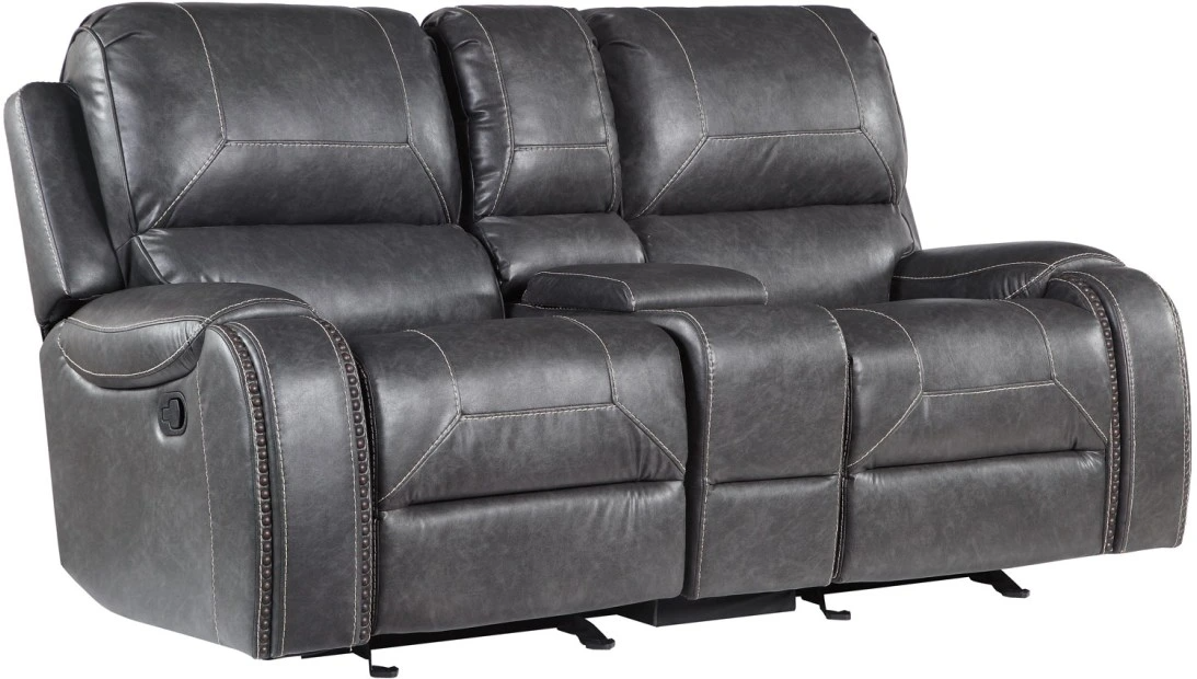 The loveseat has dual glider/recliner ends and features console with hidden storage and 2 cupholders; also has 2 USB charging ports and electrical outlet