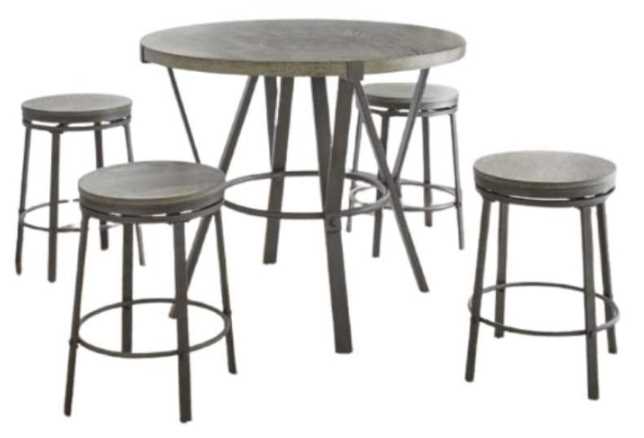 Mixed media counter set with compact design and stylish gray finish. Portland features swivel counter stools with stretchers for added strength and comfort and the round dining table fits well in any dining setting.Read More