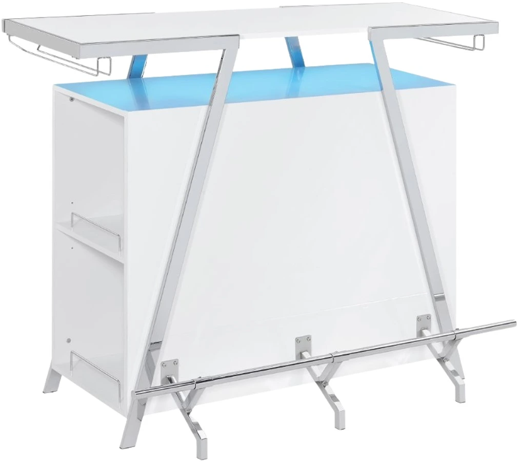 The Zena Bar with LED Lights is perfect for starting your party with style. Featuring a white and chrome design, it boasts a modern geometric shape. It efficiently holds all your bar necessities, including adjustable shelves, a bottle rack, and hanging stemware holders. The highlight of the Zena Bar is its touch-activated LED lights underneath the top.Read More