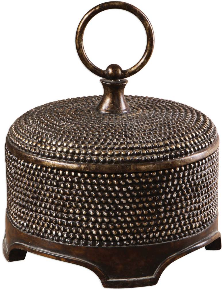 This ornate box features a distressed, burnished wash over silver beaded details with a dark chestnut brown foot.Read More
