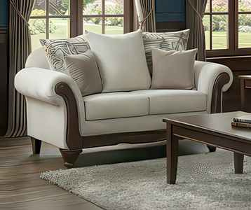 The first thing you will notice is the exquisite feel of the upholstery. The base fabric is luxuriously soft to the touch, inviting you to relax. The light fabric is framed beautifully by detailed, carved wood trim finished in a deep, rich tone that highlights the rolling armrests and elegant feet. To complete the designer look, this loveseat comes standard with coordinated, decorator-inspired accent pillows featuring complementary patterns and textures, adding depth and style.