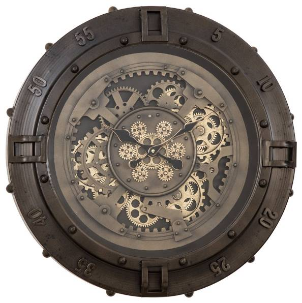 The minute dial features Arabic numerals displayed in multiples of five, while the face of the clock with moving gears is covered with glass. This clock's unique charm comes from the layers of overlapping gears in brass finish and surrounding mechanics, in an aged copper finish. The overlapping of these three complementary finishes adds depth and texture to the piece. The clock is powered by a quartz movement that keeps the black spade hour and minute hands ticking away in perfect time. With its industrial look and ornamental features, the Valencia Metal Wall Clock will add a touch of rugged charm to any space. Don't miss out on the opportunity to tell time in style with this truly unique piece.